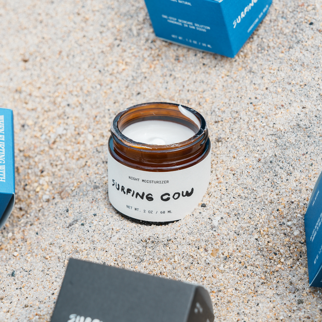 After using surfing cow sun balm for a few months I became obsessed with my skins soft and hydrated feel. But when I wash my face before bed I need a moisturizer that doesnt have zinc or feel as heavy as the sun balm. This new night moisturizer is perfect! Still get that ultra moisturized feel without feeling greasy. My skin loves it! I now have the perfect quiver for my skincare routine.